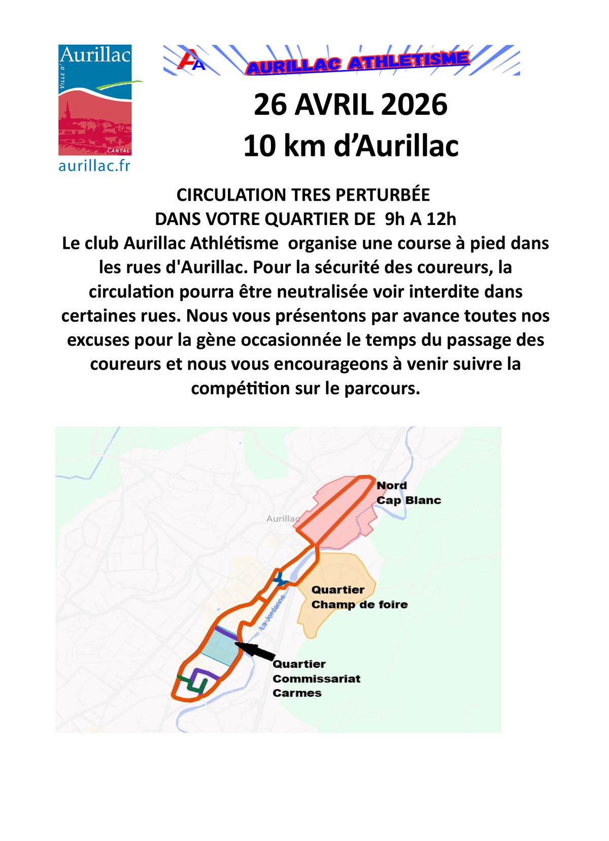 Le club d’Aurillac Athlétisme organise la 3ème édition des 10 km d’Aurillac, le dimanche 26 avril 2026 de 9h à 12h.