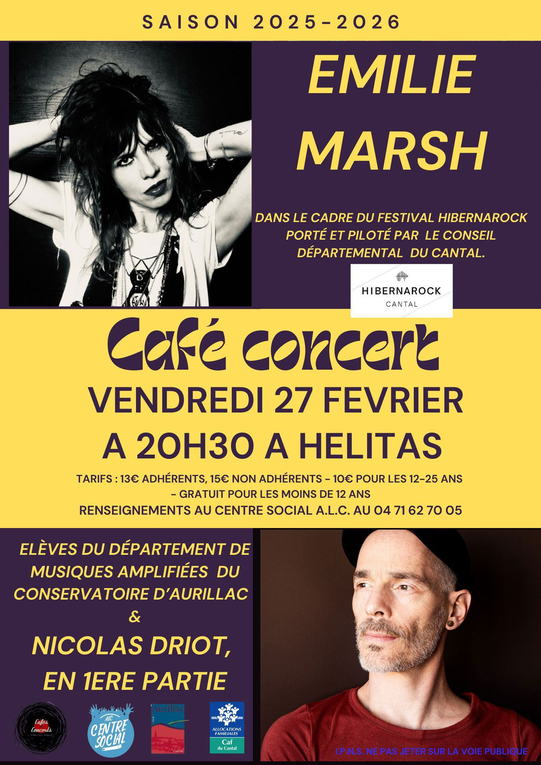 Au programme : L’énergie rock d’Émilie Marsh et l’univers de Nicolas Driot. En ouverture de rideau, découvrez le talent des élèves du département de musiques amplifiées du Conservatoire d’Aurillac ! 🎶