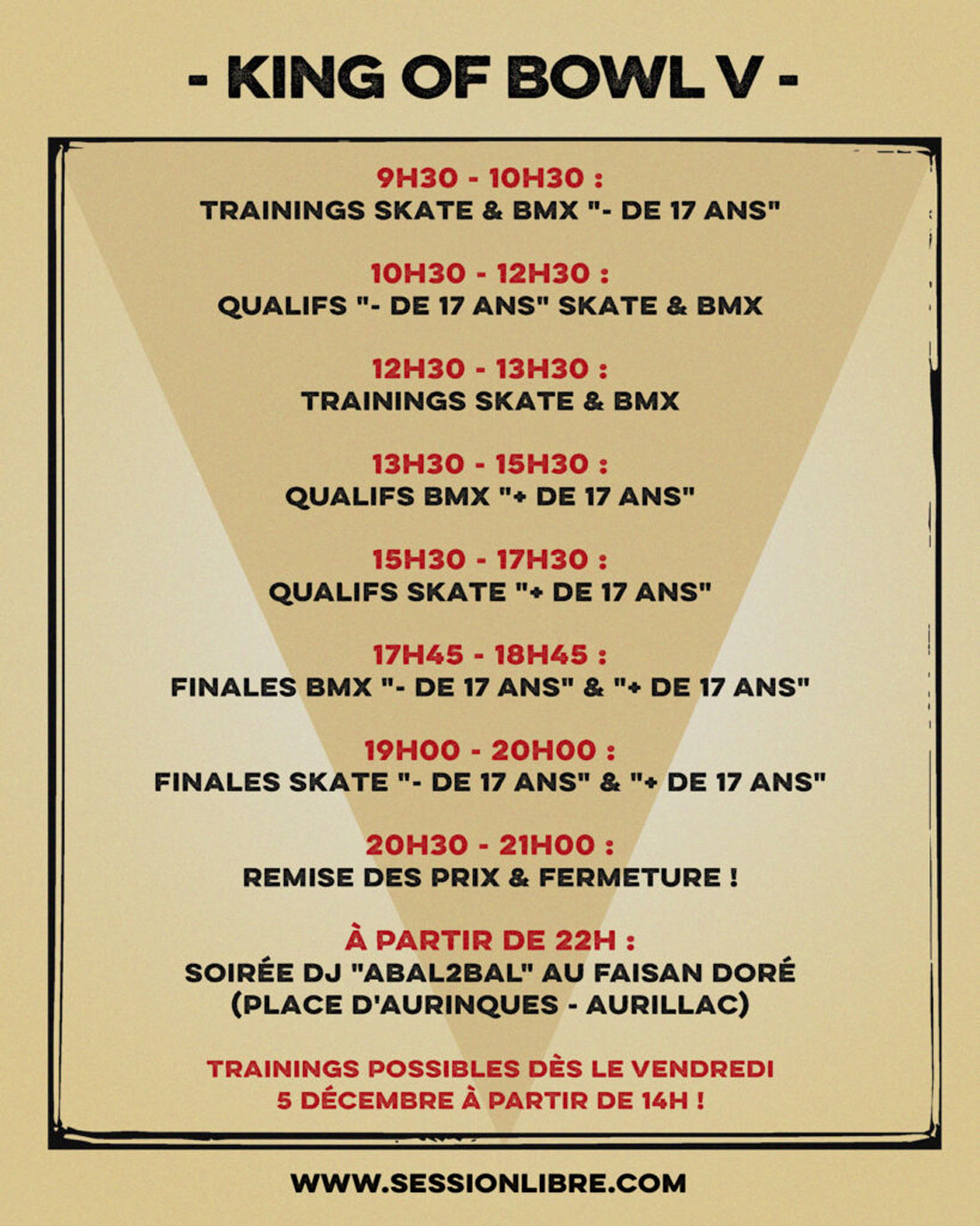 Session Libre vous donne rendez-vous pour la 5ème édition du « King Of Bowl » ! Au programme : contest bowl Skate et BMX, buvette et restauration locale, after party au Faisan Doré… Le tout dans une ambiance survoltée et avec un total de 1 200 € de prize money pour les catégories « + de 17 ans » en Skate & BMX !