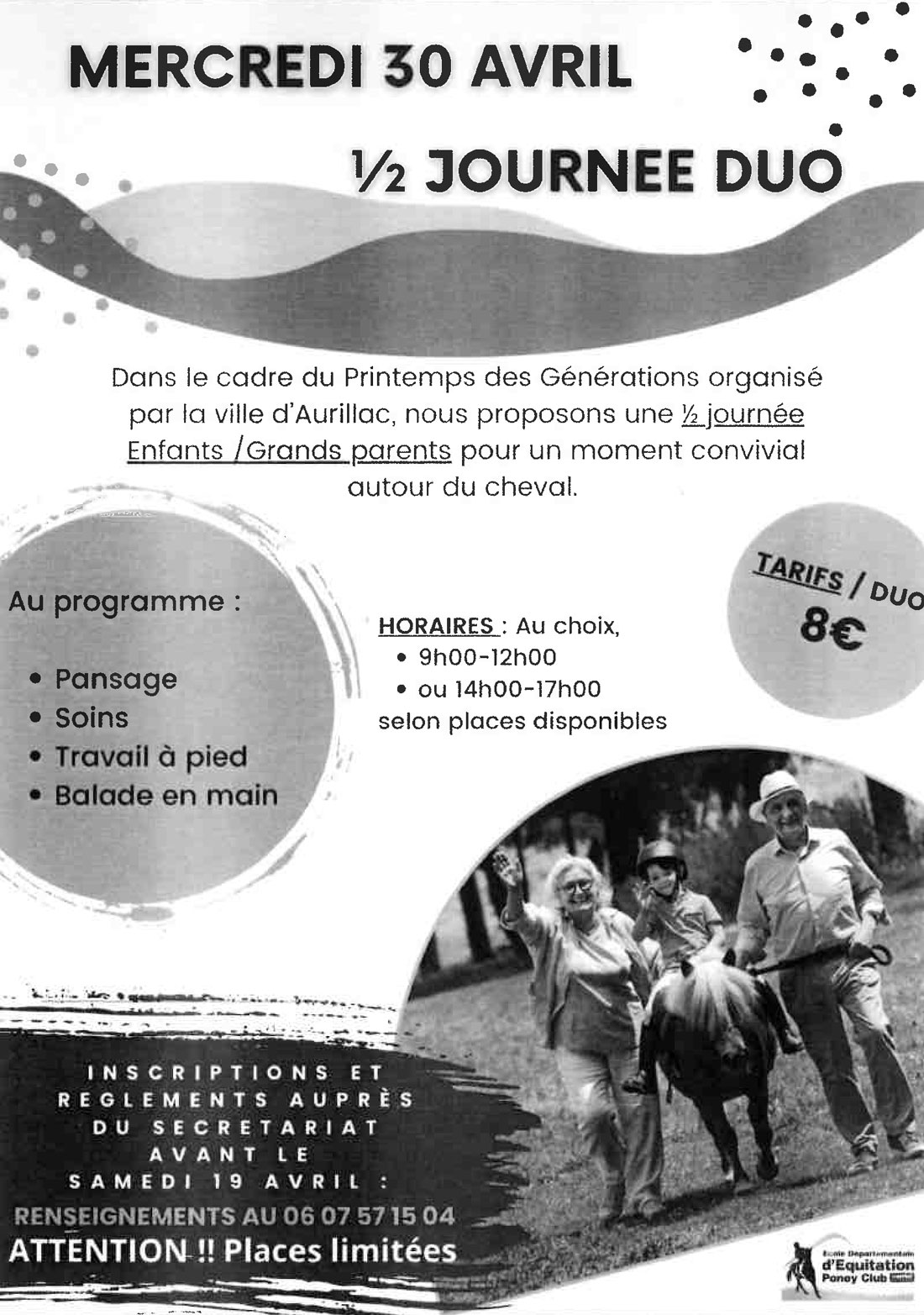 de 9h à 12h et de 14h à 17h, venez passer un moment familial en duo (enfants / grands-parents ou parents) sur l’approche relationnelle du cheval : pansage, soins, travail à pied et balade en main.
