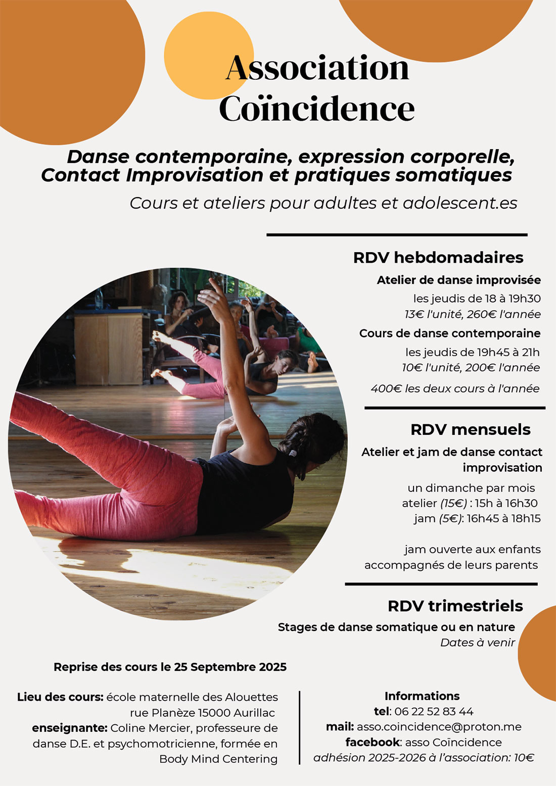 L’association Coïncidence a pour objet la découverte et l’exploration de différentes approches du mouvement (danse contemporaine, contact improvisation et danse improvisée) et de pratiques somatiques.