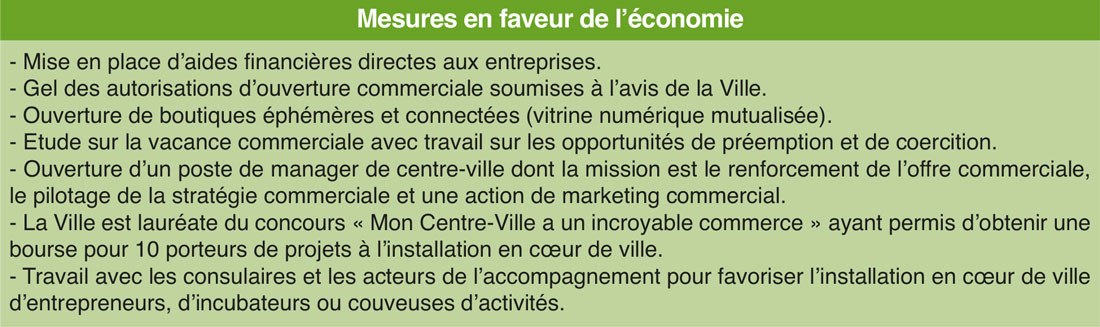 Au-delà des attentes des Aurillacois sur l’offre commerçante du cœur de ville et les questionnements des commerçants eux-mêmes (cf. § nouveaux services), la Ville d’Aurillac souhaite s’engager encore un peu plus et soutenir le commerce de centre-ville. Pour montrer son soutien et soutenir un cercle vertueux qui engage tout le monde, la Ville lance plusieurs chantiers, y compris si l’économie n’est pas de sa compétence :