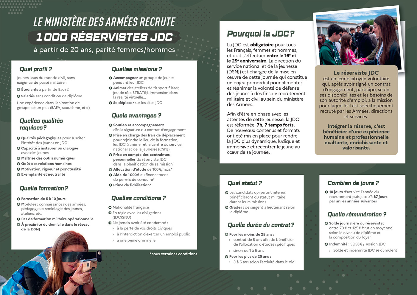 La ministère des Armées recrute 1000 réservistes JDC (à partir de 20 ans).