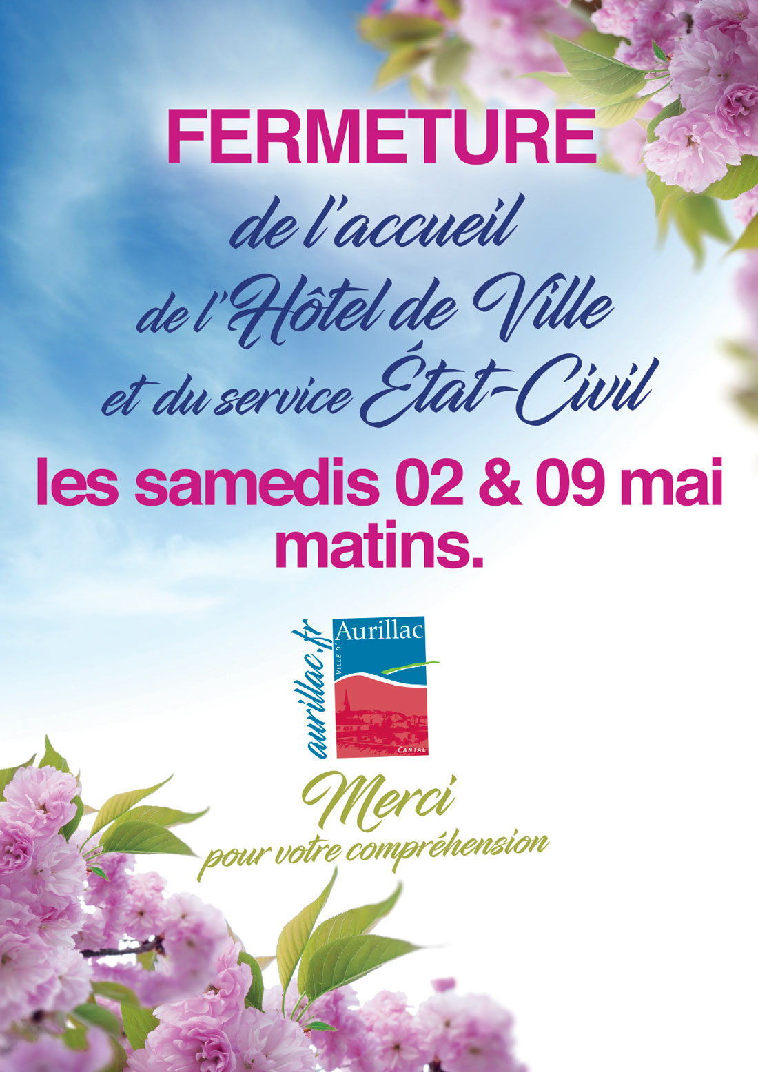 La Ville d’Aurillac informe les administrés que l’accueil de l’Hôtel de Ville ainsi que le service État-Civil seront exceptionnellement fermés les samedis 02 et 09 mai au matin.