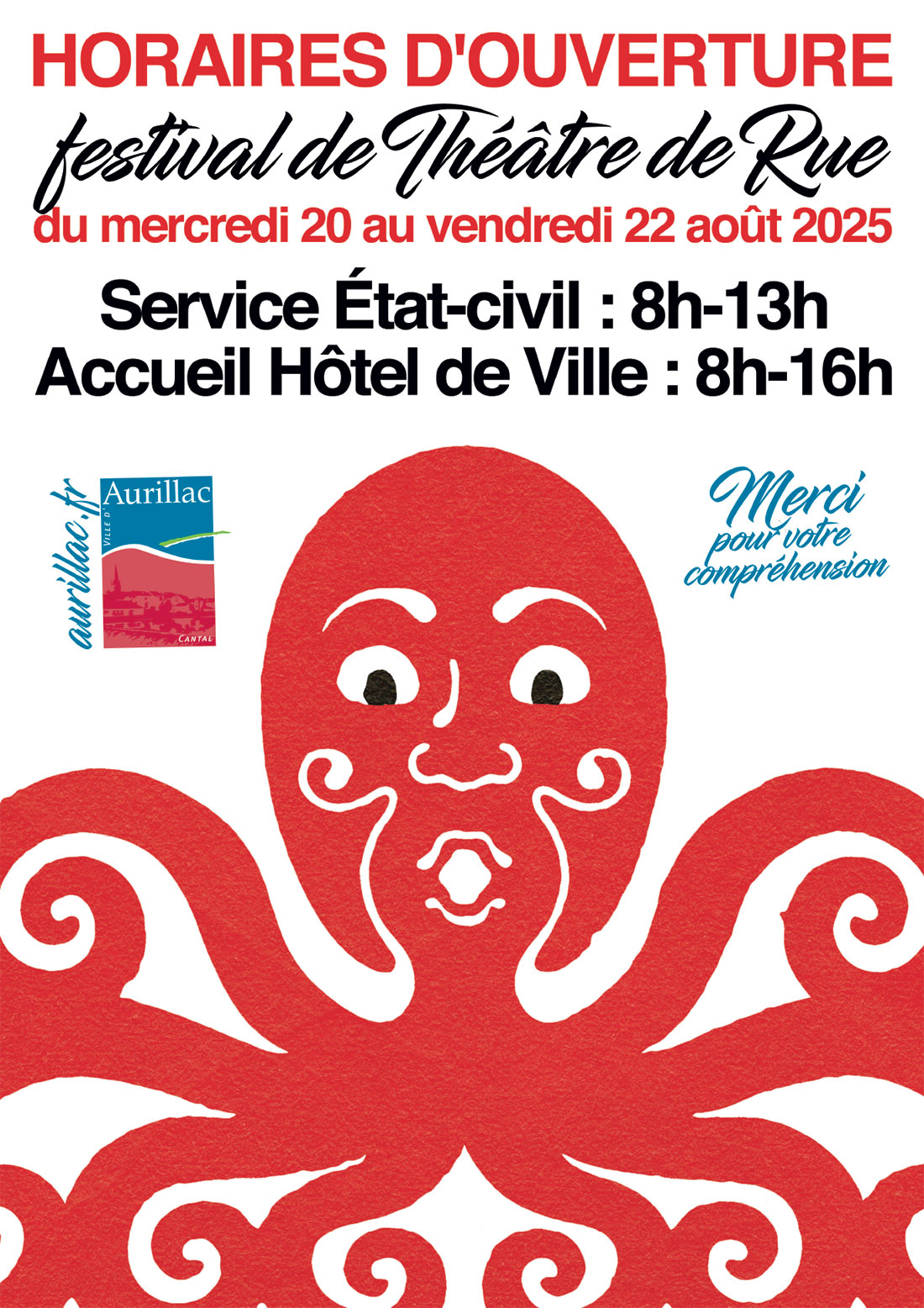 Service État-Civil : ouverture au public du mercredi 20 août au vendredi 22 août, de 8h00 à 13h00.