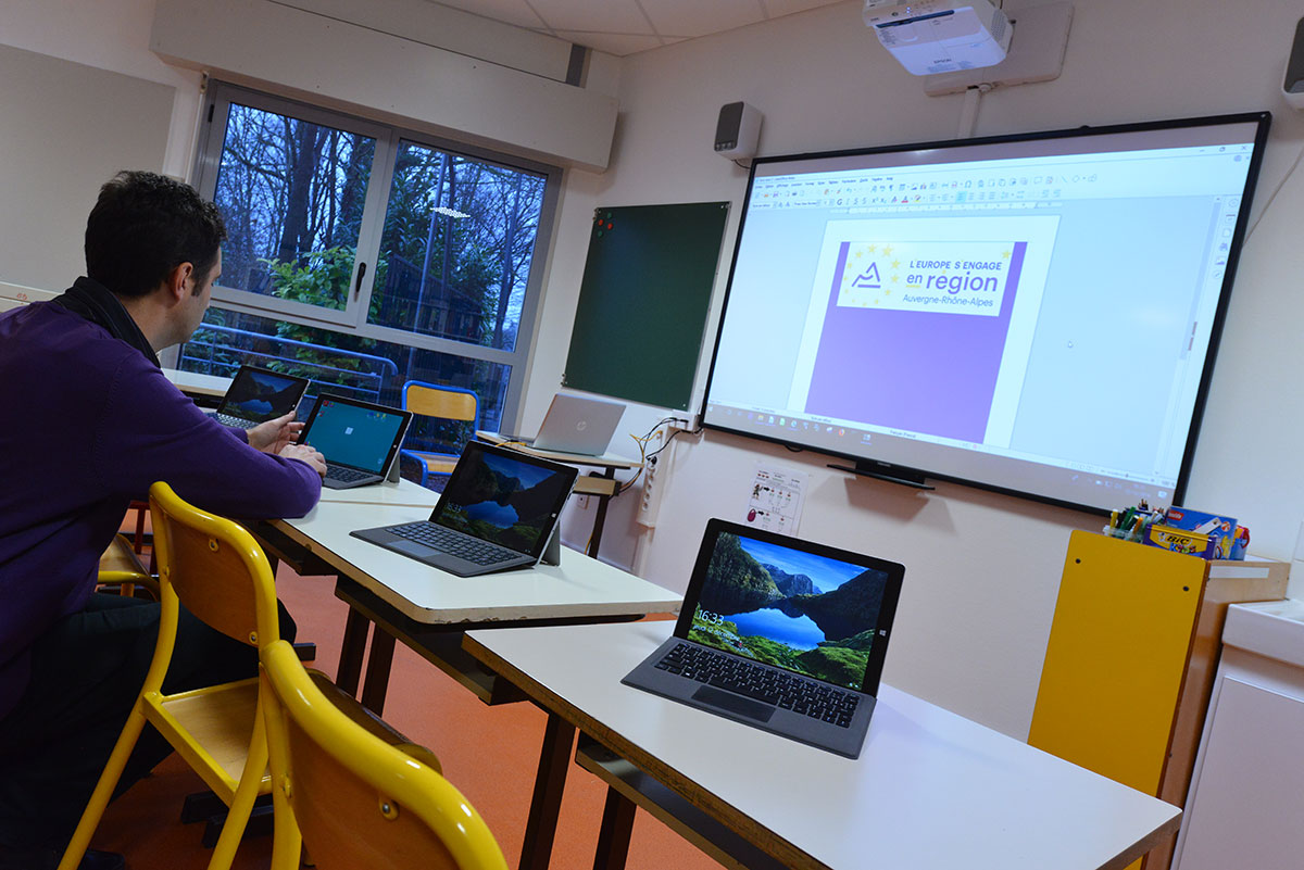 La Ville d’Aurillac, grâce au concours financier du FEDER, continue le développement de tableaux blanc interactif et de classe mobile dans ses écoles.