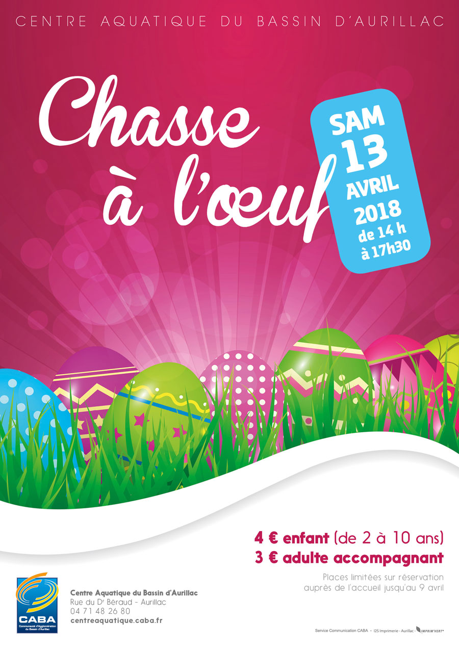 Samedi 13 avril de 14 h à 17h30, le Centre Aquatique du Bassin d’Aurillac propose une chasse à l’œuf pour les enfants de 2 à 10 ans ! La recherche des oeufs débutera sur les espaces extérieurs avant de se poursuivre dans les bassins. Plusieurs jeux seront proposés en fonction des tranches d’âge.