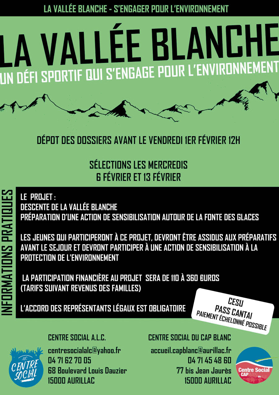Le service des sports de la Mairie d’Aurillac organise un séjour « La Vallée Blanche » en collaboration avec les centres sociaux du Cap Blanc et d’Hélitas. Dépôt des dossiers de candidature avant le vendredi 1er février 12h !